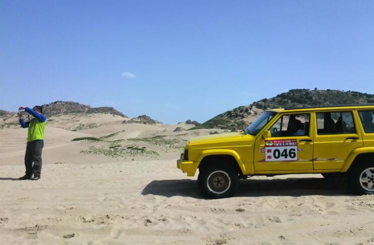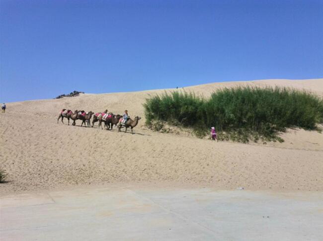 車子駛進(jìn)玉龍沙湖的停車場,我的思緒由漫漫歷史回到眼前景色。小小的一個湖,大大的看不到邊際的沙漠。據(jù)說這就是歷史上有名的科爾沁草原,現(xiàn)在也只能叫科爾沁沙地了吧。湖水的面積越來越小,湖水周圍一片小小的綠洲,綠洲外圍就是望不到邊際的沙漠。在我們出行前,旅行社的對這里的描繪是這個樣子:“讓您感受茫茫大漠、沙丘滾滾,連綿起伏的雄渾與壯美,金黃色的沙坡掩映在藍(lán)天、白云下,有一種茫茫沙海入云天的壯麗景象。觀賞陰石、陽石、石長城等沙漠奇觀,體驗(yàn)夢幻沙漠所帶來的無限驚奇!边@里說說的我的實(shí)際感受:沙子很白很細(xì),光著腳踩上去很燙,爬到沙坡上面,我的腳已被燙的發(fā)紅。站在沙坡上面遠(yuǎn)望,沙丘滾滾,連綿起伏是真實(shí)場景,但是我卻不能和雄渾、壯美等詞匯聯(lián)系在一起,也許是受后邊幾日景色的干擾,也許是在港城海邊也有很多沙地的原因,沙地并不算這幾天旅行中的美景。在玉龍沙湖的游覽中有兩點(diǎn)最記憶猶新:越野車和兩部電影的外景地。這里有兩個自費(fèi)項(xiàng)目,越野車和騎駱駝,我選擇了越野車。交了錢分了組后,我和馬姐、小費(fèi)、小霍四人一車,聽導(dǎo)游說越野車很怕人,那三人就一下做到了后排,我只好做到副駕駛位置。記好安全帶后,司機(jī)帶我們沖進(jìn)沙漠深處,一開始道路還算平緩,我們的心也是平緩的,坡度逐漸陡峭起來,后排三位的叫聲也越發(fā)尖銳,突然一個幾乎90度的坡沖下,車子似乎好像失去了重力,直接下去了,后排三位女士的聲音已經(jīng)不只尖銳了,近乎聲嘶力竭,我坐在前排,可能是能看到下邊的原因,并沒有覺得如此可怕,只是覺得很爽。越野車就這樣起起伏伏的狂奔了20分鐘又回到了遠(yuǎn)點(diǎn),驚險刺激,對的起120元的價位。這里是電影《萬物生長》和《后會無期》的外景地,《萬物生長》中范冰冰和韓庚的激情戲就是在這片沙子中拍攝的,就沖這個我也要光腳在沙堆上走一走;據(jù)劉繼偉說他看到了《后會無期》中的那顆衛(wèi)星,我卻已經(jīng)走累了,不去再看那顆衛(wèi)星了和大伙坐在山地旁邊的亭子里休息,順便看看別人騎駱駝。不到4點(diǎn)的功夫我們都已經(jīng)從景區(qū)出來了,坐車去往翁牛特旗的旗政府烏丹吃飯休息。