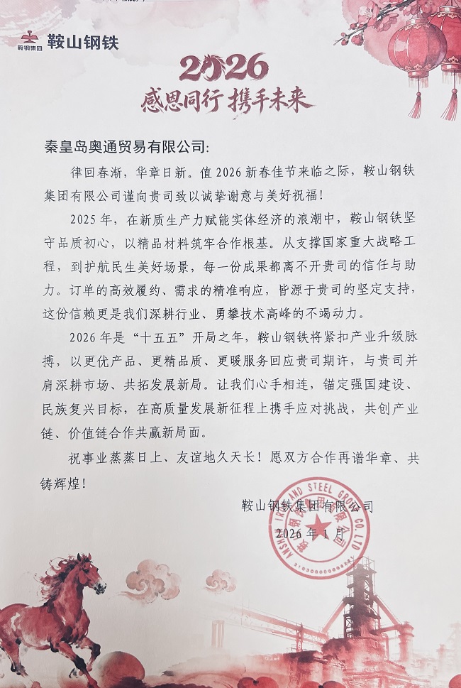 近日,我司秦皇島奧通貿(mào)易有限公司收到來自鞍山鋼鐵集團(tuán)有限公司的2026年新春賀函。這份來自國內(nèi)鋼鐵行業(yè)領(lǐng)軍企業(yè)的誠摯祝福,既是對(duì)過去一年合作成果的高度認(rèn)可,也是對(duì)雙方未來共贏發(fā)展的深切期許。
